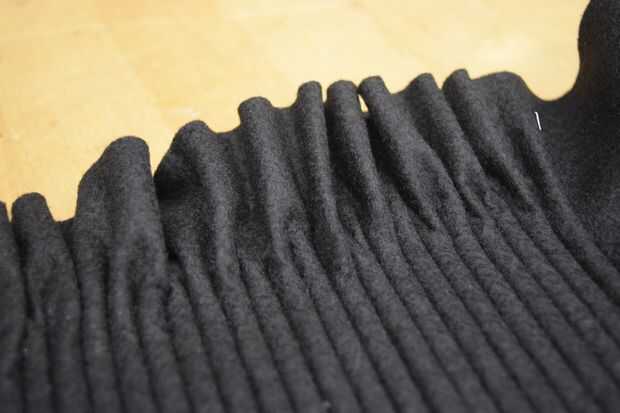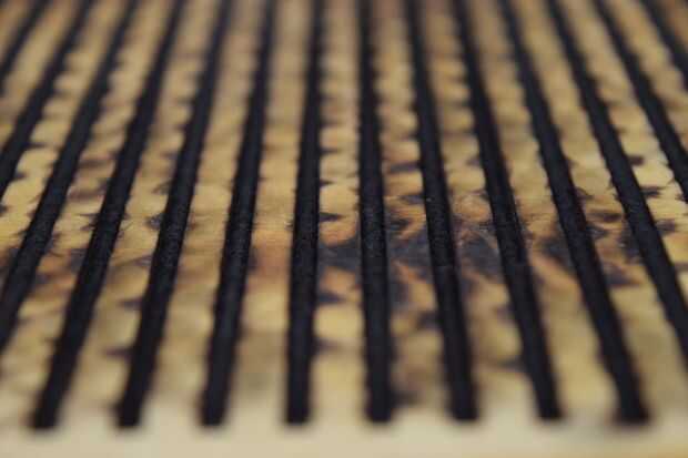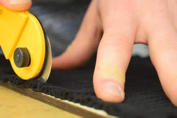 Debería notar los voladizos que hemos creado. Usted querrá recortar aquellos. También puede cortar el exceso en los dos extremos. Encontré que un cortador rotativo de tela y un gobernante hicieron un trabajo maravilloso. Recortar los lados hasta el punto donde empiezan las ranuras. Repetir en ambos lados. A continuación, recoger nuevamente la herramienta de confianza usted ha estado usando y empezar a meter los bordes de fieltro en las ranuras. Ahora, levante la pieza de la superficie de trabajo y ejecute la herramienta por cada ranura con presión firme. Nuestro objetivo es llegar a todos los pliegues fieltros uniformemente a la superficie opuesta. Puede visualmente el reverso del tablero para asegurarse de que usted ha logrado.