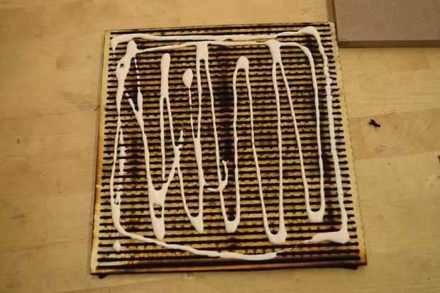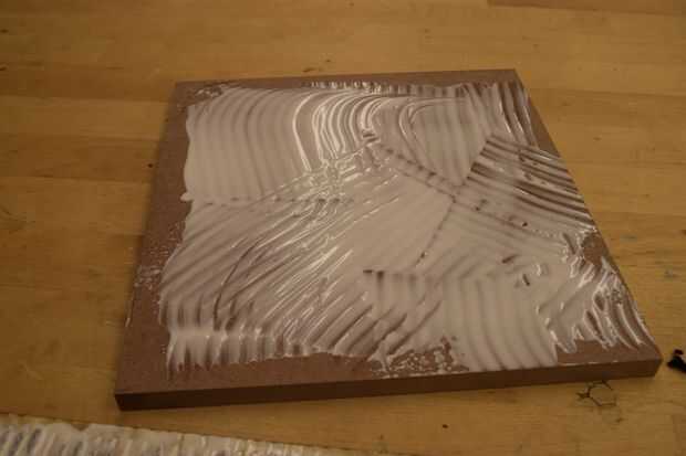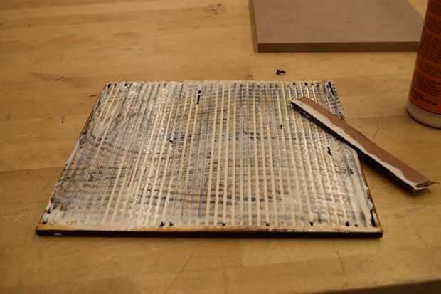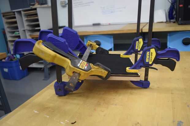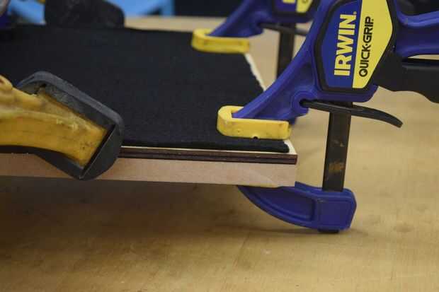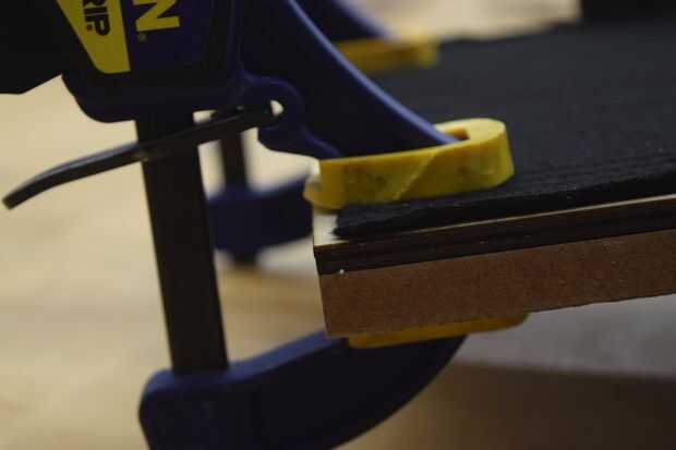 Ahora que tienes el fieltro todo preparado y bastante, sacar el pegamento de madera. Funcionará cualquier pegamento para madera, usé el pegamento para madera marca gorila porque eso es lo que el estudio. Aplique pegamento liberalmente en el revés del fieltro. Utilice un trozo de algo para extender el pegamento y asegúrese de que se mete en las grietas. Aplique pegamento en el MDF y difundir todo así. Compañero las piezas y la abrazadera. Una pequeña cosa que noté fue que los bordes externos del marco lasered fueron cediendo, por lo que los sujeta horizontalmente.