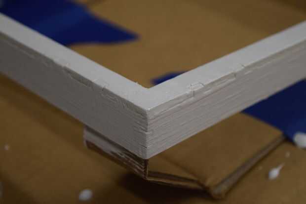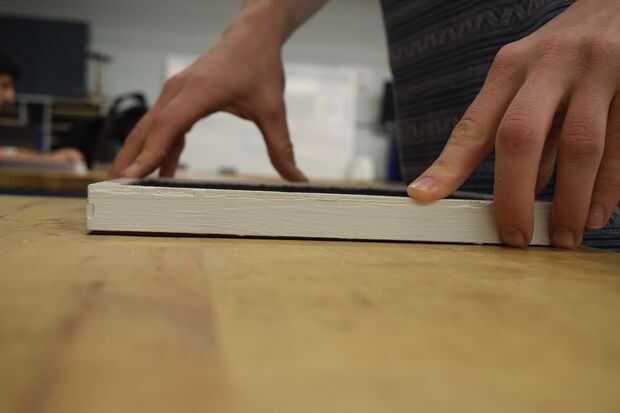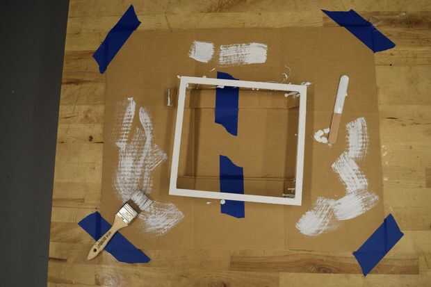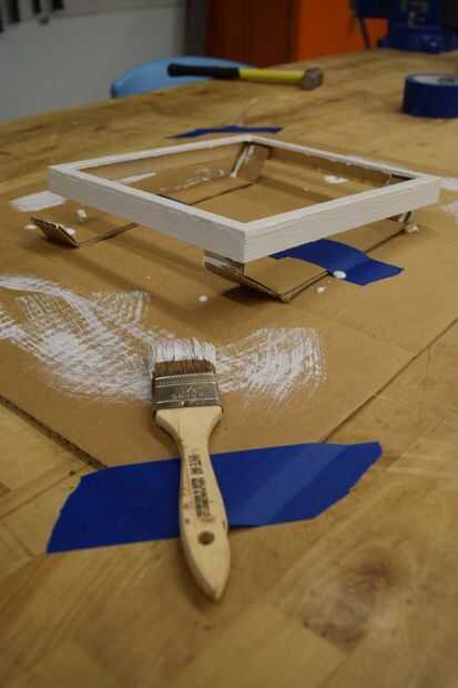 Lijar todo un poco para eliminar cualquier materia áspera que ya estaba en la madera contrachapada. Luego con un poco de corte de cartón creativo hice un pequeño dispositivo para suspender el marco sobre el área de pintura. Grabado abajo, añadió el marco y llegó a la pintura. Usé lo que tenía el estudio, que era pintura de látex blanca y algunos pinceles obstruidos. Honestamente resultó para ser muy agradable, dando el marco especie de pintó aspecto de grano de madera. Cuando todo fue hecho de secado, tiró de él y presiona hacia abajo sobre el tablero de fieltro. El láser de corte a una dimensión tan perfecta que no necesitaba siquiera cualquier hardware para unirla. Con un poco de ayuda de la aspiradora de taller, este tablero de fieltro es limpia y lista para rellenarse con tanta ironía como mis deseos de corazón.