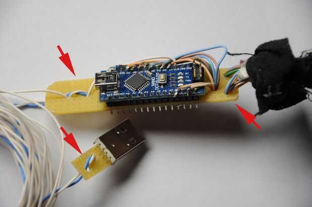 Para proteger las uniones de soldaduras de estrés yo había montado el Arduino y el conector USB en un plato y pasar los cables a través de dos agujeros como descargas de tracción.