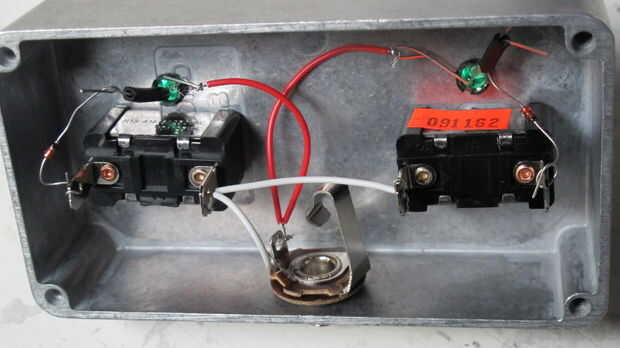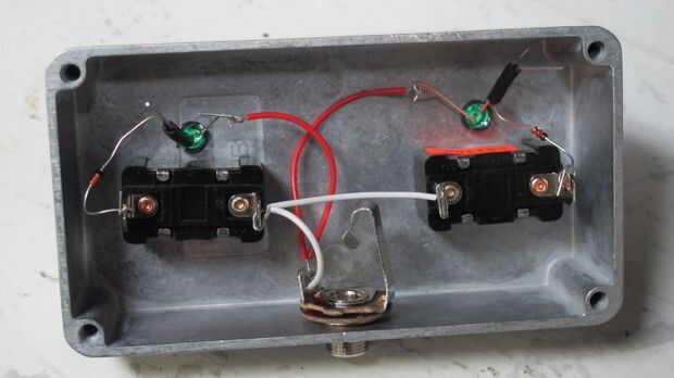 Traté de tomar una imagen clara de todo el circuito antes de soldar. Brevemente, necesita hacer 3 agujeros en tu caso: 1 para el jack mono hembra de 1/4 y 2 para los interruptores de dsps. Luego con algunos alambres, a construir el circuito.