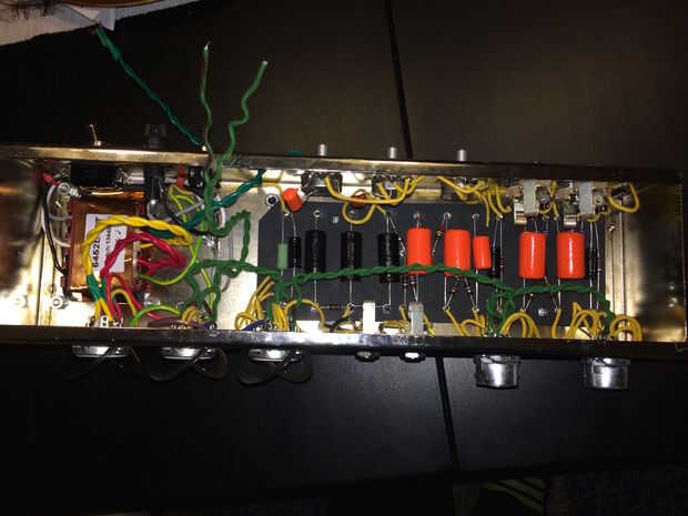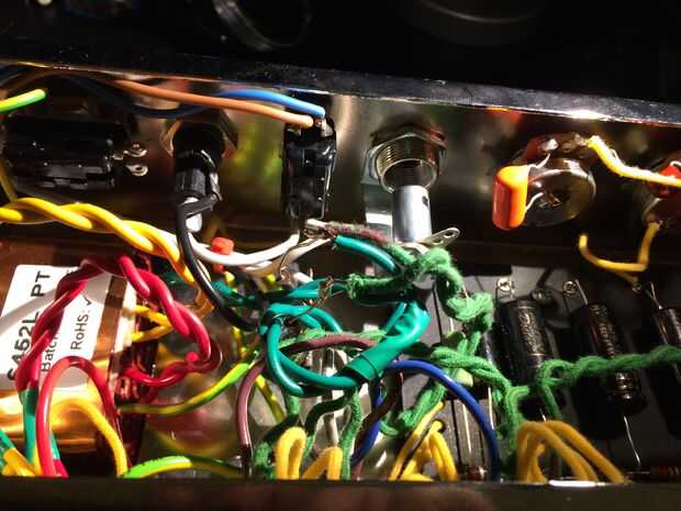 Ahora pueden conectar los cables secundarios del transformador a la toma del tubo del rectificador y los filamentos (circuito del calentador del tubo) pueden establecerse con el verdes push-back-cables trenzados. El filamento está conectado con los alambres verdes del transformador y el enchufe de la lámpara piloto. Ambas líneas están conectadas a tierra a través de resistencias de 100 Ohm. En este punto la toma de piloto original no estaba disponible (ya descrito), por lo tanto temporalmente utiliza un zócalo de lámpara del automóvil para continuar el trabajo.