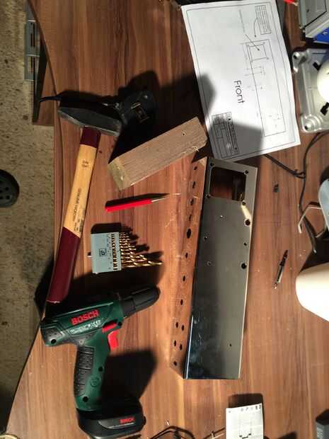 De todos modos, dos agujeros adicionales tienen que ser perforados en el chasis una contratracción para el cable de alimentación y un orificio adicional para el montaje después de la Junta de la torreta. TAD proporciona una plantilla de taladrado para marcar los agujeros para taladrar. (Parece que TAD compra el chasis de un proveedor de sub y los agujeros adicionales tienen que ser perforados para apoyar TADs clon kit).