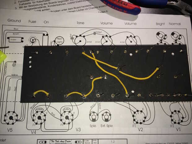 Cuando todas las piezas se sueldan, es posible las conexiones en la parte inferior de la Junta de ojete. Como en los amplificadores de Fender originales cables amarillos de push-back se utilizan para todas las conexiones. Estos cables son recubiertos y aislados con tela amarilla. Para soldar el aislamiento es sólo empujó la espalda. Esto permite un manejo fácil y rápido de los cables.