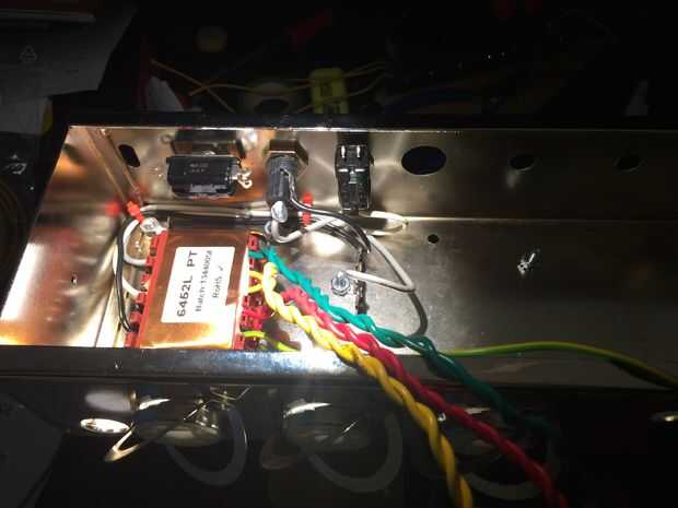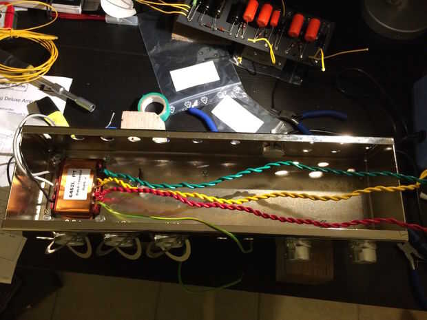 Ahora finalizado el Comité ojal podemos empezar a montar el transformador hasta el lugar preparado en el lado izquierdo del chasis y giro que secundario transformador los cables como se puede ver en la imagen. Asegure los cables trenzados con cinta aislante. A continuación, comenzar a instalar el enchufe fusible, interruptor de la red y conecta los cables del transformador de la energía primaria, como puede verse en el documento de diseño de amplificadores. Trate de dejar los cables cercanos por el chasis.