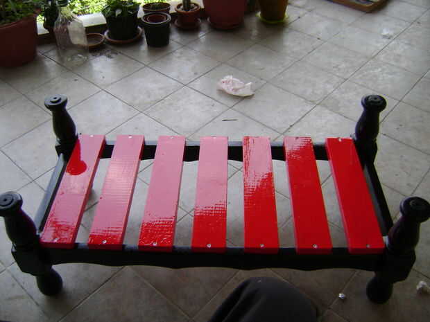 Tomamos las hojas de madera rojizas y plase sobre las patas de la mesa...