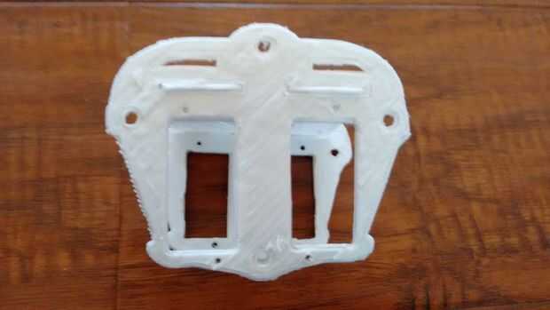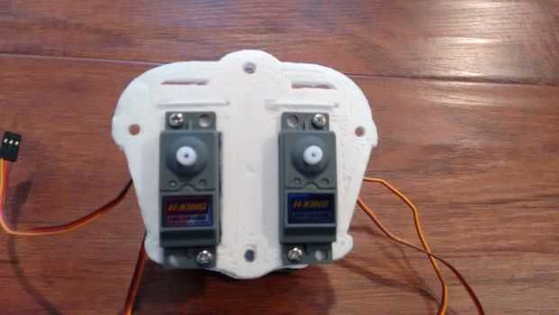- Por último, poner el servo de cuatro en la apertura grande en la pieza de la espina dorsal con la cabeza del servo hacia arriba. Fijar los servos con los tornillos.