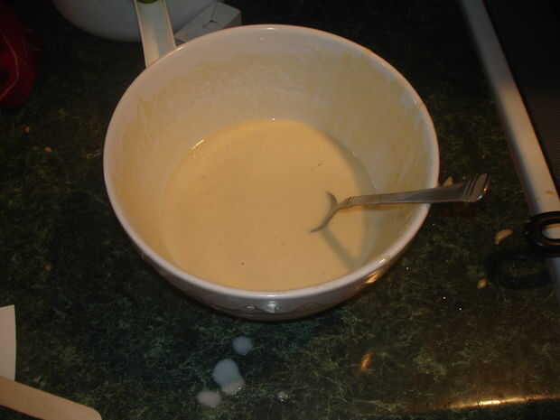 los principales ingredientes en un bol grande se mezclan con su bate. Asegúrese de que no queden grumos izquierda