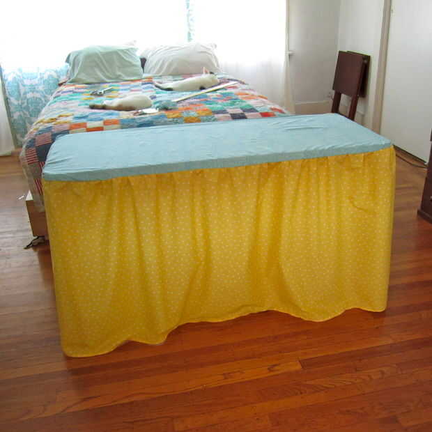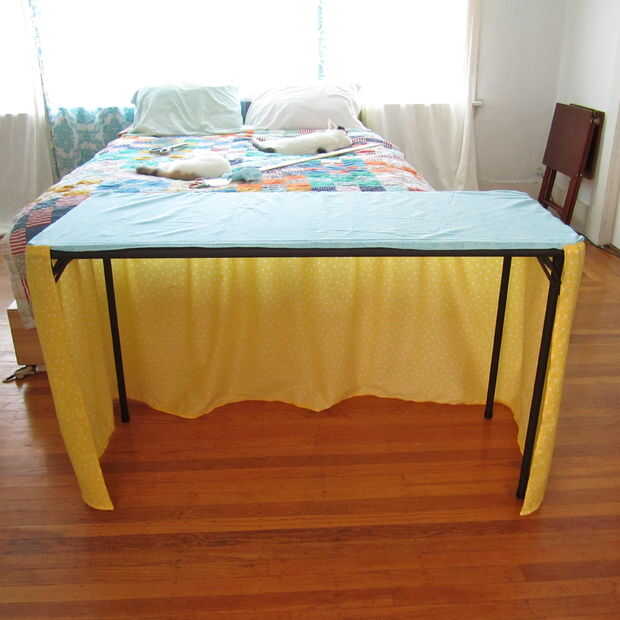He creado un mantel ligeramente recogida que está abierto en la espalda para que pueda obtener el almacenamiento debajo de la mesa super rápido! Esta cubierta de tabla llevará un par de horas para hacer, pero definitivamente vale la pena el tiempo si usted está tratando de arte ferias barato.
