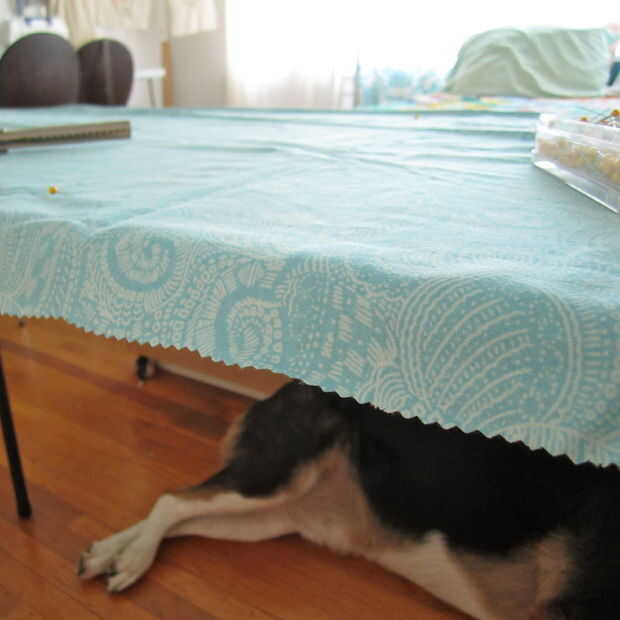 Usted también podría poner la tela sobre el piso, colocar la tabla y trace una línea alrededor, sino que parecía mucho más trabajo.
