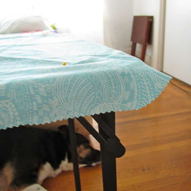 Ahora, usando la parte inferior del tablero (la parte inferior de la barra de metal debajo de la mesa, para ser precisos) como guía, baje un poco la tela y cortar todo el camino alrededor. Sigue de cerca - de las curvas en los bordes de la tabla tienen que ser claramente curvado, que le ayudará con la costura más tarde!