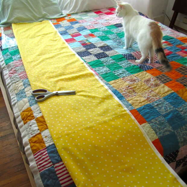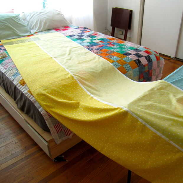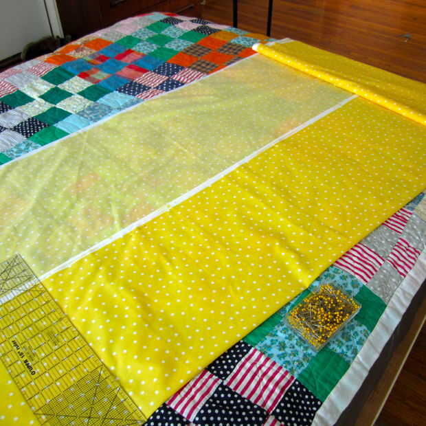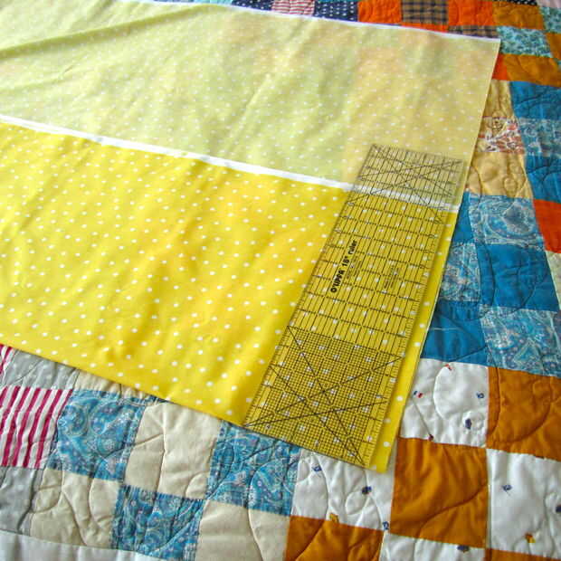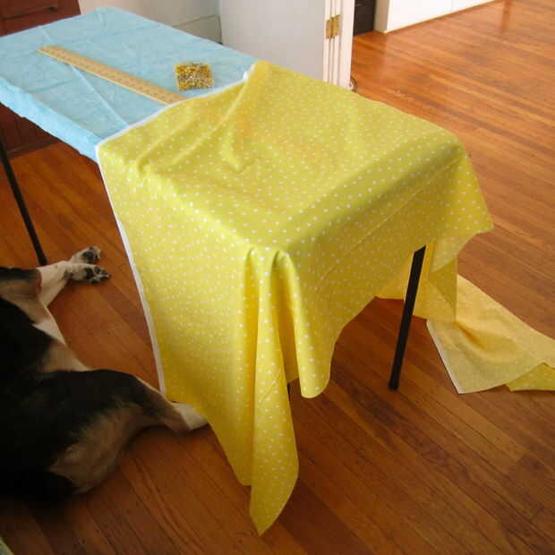 La mejor forma que he encontrado para hacer esto cuando se trabaja con un gran trozo de tela es doblar la parte inferior de la tela a la mitad de la altura que vas para. En este caso, estoy doblando sobre la tela de 14,5 pulgadas. Doblar, medir y luego pin y seguir esto hasta abajo de la tela. PIN por lo menos cada pie para facilitar el corte. :)