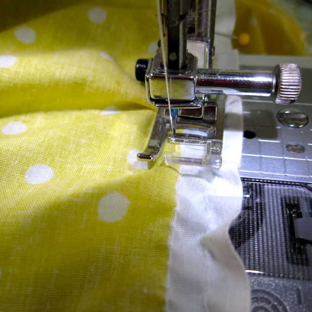 Coser un poco a la izquierda de la puntada de reunión más lejana, como se muestra en la foto. Mantenga el borde de la tapa de tabla, alineado con el borde de la falda para obtener mejores resultados.