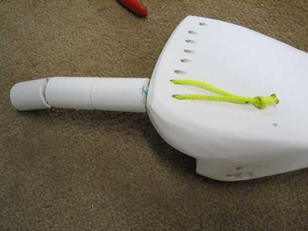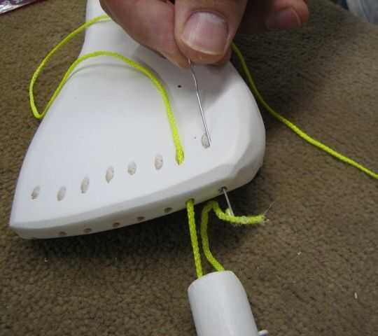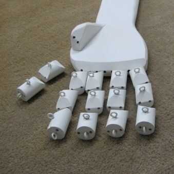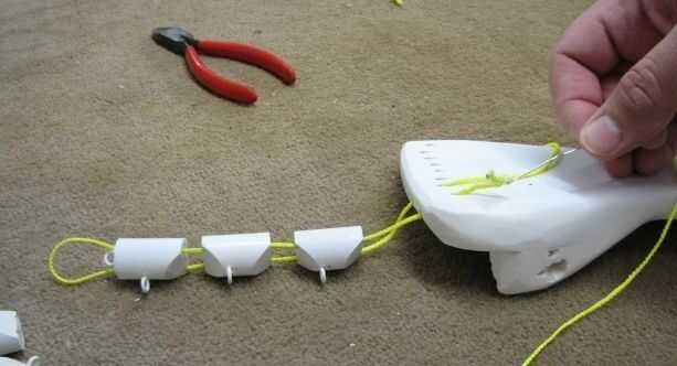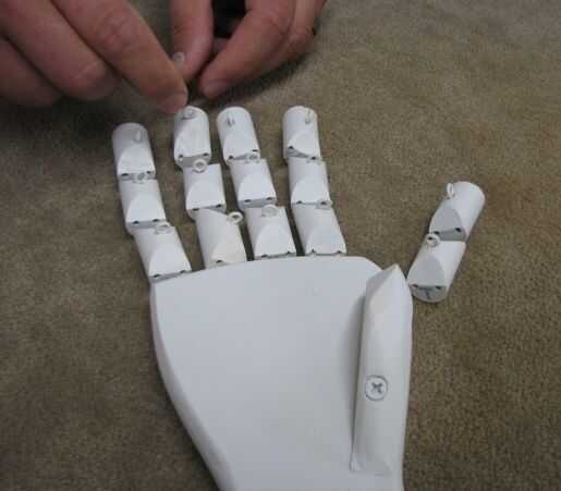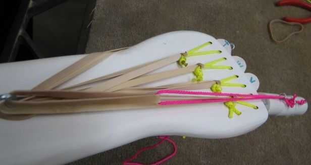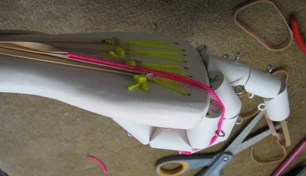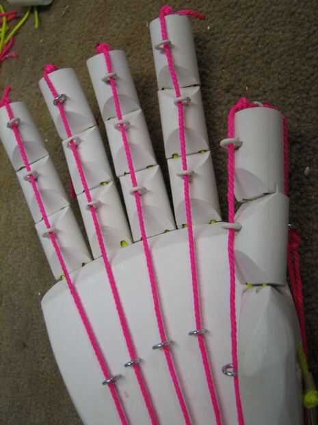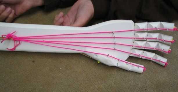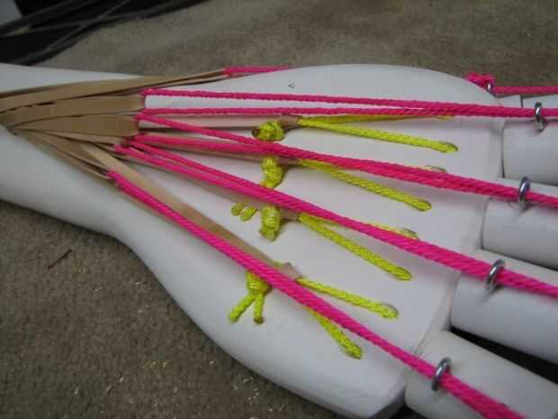 Empezar por encadenar los tendones en la parte superior de la mano primero. Atar a la anilla de la punta de los dedos primero. Alimentación a través de los ojales en los segmentos medio y primer dedo luego a través de una banda de caucho. Alimentación a través del ojillo en el primer segmento y temporalmente atarla a la anilla del segmento medio. Dejar cierta holgura y no hacen este nudo permanente hasta que acaben adentro tendones y probado todo. Gancho de la cinta de goma alrededor del gancho de la taza. Las gomas del tendón superior debe apenas ser apretadas.