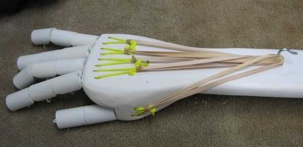 Doble cada dedo y notar donde la yema del dedo golpea la palma. Marque este punto para cada dedo, taladre e instale un ojal. Atar una cuerda de tendón en el ojal de la punta de los dedos y alimentar por el resto. Atar todo el interior cuerdas de tendones juntos cerca de la mitad del antebrazo. Puede adjuntar una sola banda de caucho a este grupo de cuerdas y jale ligeramente un ojal en el codo. Esto mantendrá el interior cuerdas de tendones de conseguir enredado y hacerlos fáciles de agarrar por separado.