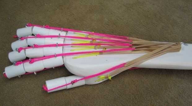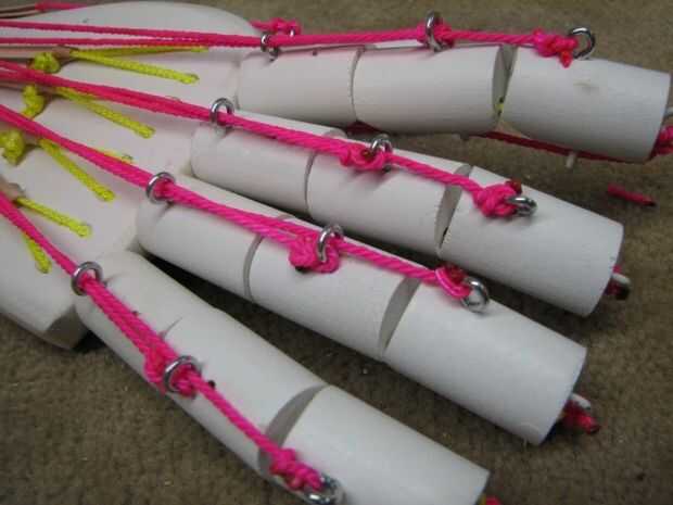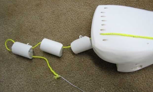 Empuje el gancho profundo el hoyo 1 y gancho de la cuerda del ligamento. Utilice alicates para tirar a través. Tenga cuidado con su mano libre para que no se enganche a tu piel. Alimentación del ligamento a través de la mano el dedo, a través de la punta, hacia arriba el dedo y a través de la mano. La cadena a través de una banda de caucho de alimentación y luego atar cada ligamento en un nudo para hacer un bucle que termina en el centro de la parte posterior de la mano. Tensar la goma elástica y ver cuánta tensión se necesita para sostener los dedos rectos. Cadena de los ligamentos para el resto de los dedos. Tire de cada banda de goma para encontrar qué dedo toma la fuerza más para mantenerla recta. Marcar ese lugar y haga un agujero y el tornillo en el gancho de taza (obviamente en la parte posterior del antebrazo). Estire todas las bandas de goma de ligamento y gancho del gancho de la taza.