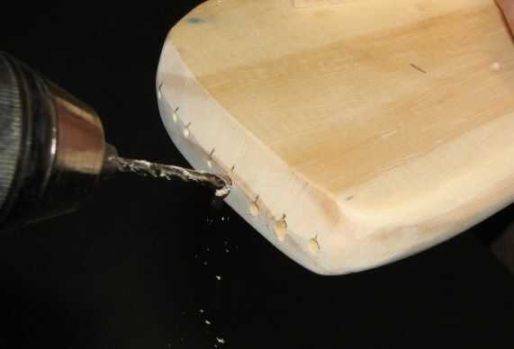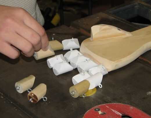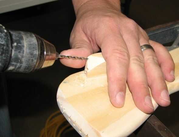 Siguiente Sydney presenta todas las piezas para comprobar el ajuste. Seleccionamos las mejores piezas conjuntas para la primera articulación de cada dedo. Etiquetamos ese extremo de cada articulación, así que podemos cerciorarnos de que permanecieron en el lugar correcto. Utilizamos índice, M-medio, anillo de R, L pequeña. Nos espaciadas estas primeras juntas por lo que veía en la mano y marcan el centro de cada agujero en la mano. Usé un golpe conjunto para marcar los agujeros de ligamento en la superficie plana (no inclinada parte!) de la pieza de mano. El golpe conjunto mantiene la broca de errante empieza a morder la madera. Luego perforé los agujeros desde el interior hacia el exterior de la mano. Los agujeros se salieron justo detrás de donde estarían los nudillos si usted hizo un puño. Asegúrese de que los agujeros de la cuesta lo más posible hacia el codo. Esto permitirá que los ligamentos tirar suavemente y sujetan las articulaciones del dedo.
