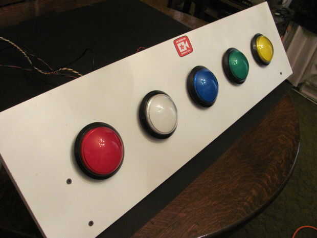 El diseño de la placa de botón debía determinarse antes de que compré la madera. Medir los botones grandes y agregar una pequeña sala de meneo. Elegí una sencilla línea recta de botones pero hay infinitas combinaciones que se puede considerar. Compré un tablero blanco estantería de hardware Lowe y cubierto de cinta azul para evitar arañazos. Entonces medí donde todos los botones irían y dibujó allí lugares en lápiz en la cinta.