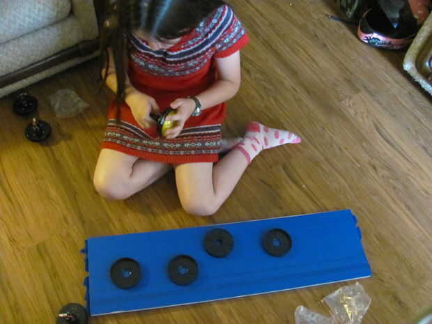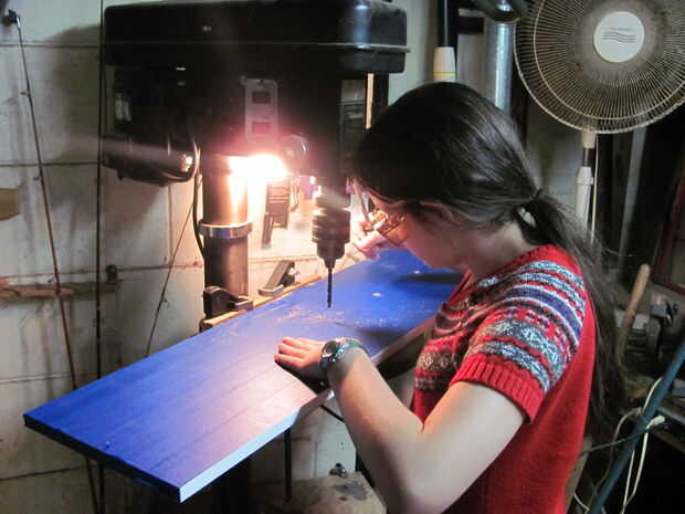 Usé un taladro para hacer los agujeros. Esto ayudó a que todo lo limpio y recto. Se puede utilizar un taladro de mano si es lo que tiene. Primero perforé un orificio con una broca normal. Pues yo utilizaba ese agujero al centro del taladro 1" espada para cortar el agujero a la medida. Puede usar un serrucho si no tienes un taladro de espada. Entonces corté algunos restos de madera en triángulos para las piernas. Esto llevó a cabo la Junta en un ángulo y para una atractiva pantalla de botones. Si pones los botones en un patrón diferente, recuerde que necesita habitación en la parte posterior para cables.
