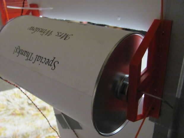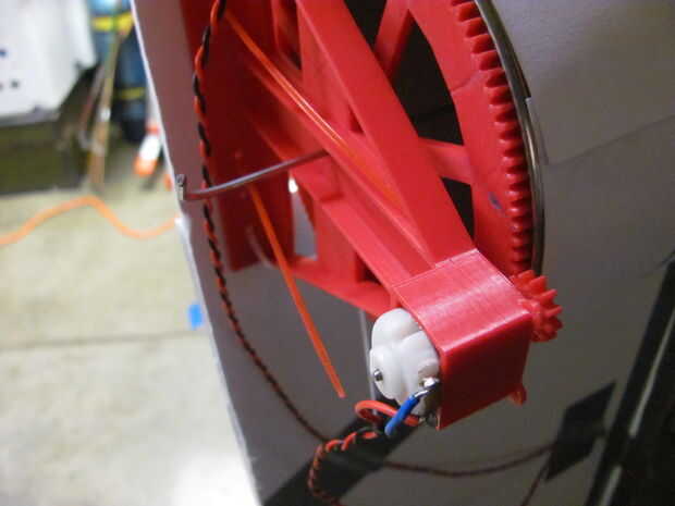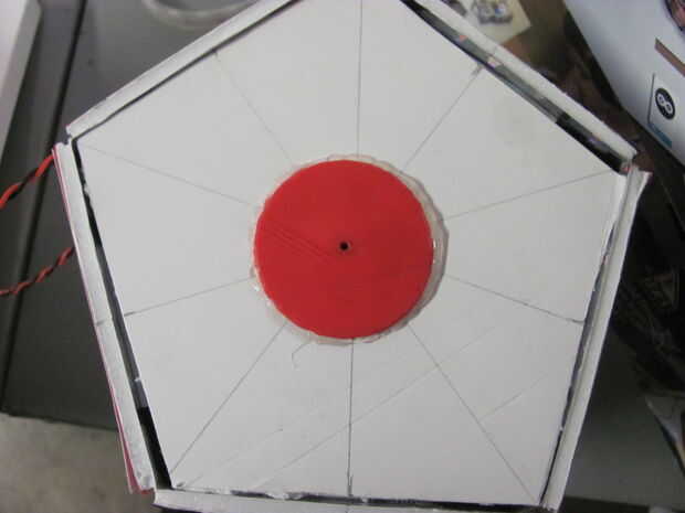 La ruleta de la foto tiene el cubo que está caliente pegado en la parte inferior. Esto se une la afición del pequeño motor de corriente continua. Este centro tiene cuatro pinzas que empujan en el núcleo de espuma para ayudar a mantener en su lugar. También hay un soporte para el motor de corriente continua que se une a la junta con ataduras de cremallera.