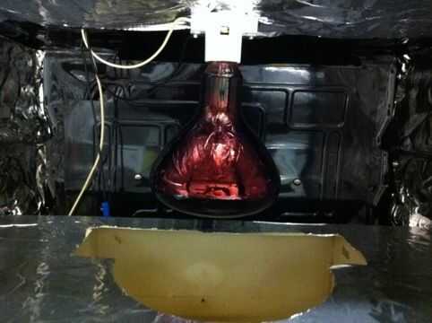 El primer paso que hice fue aplicar papel para las paredes y la superficie de la unidad del ventilador justo debajo de la luz para contener el calor mejor. Oscuro absorbe el calor, la luz refleja el calor, por lo tanto hemos conseguido calefacción constante. Para adherir la lámina a las paredes, que tomé una botella de pegamento de aerosol, rociada generosamente en la hoja y en el interior de la caja, dejar secar un par de minutos después de la bofetada que la hoja allí. El siguiente paso fue montar la lámpara que recogido de la ferretería local, perforé dos agujeros a través de la parte superior de la caja y el forro en el interior. Compré algunos completo rosca pernos sin cabeza y con tuercas de bloqueo para mantener la lámpara en su lugar. Como se puede ver hay dos cables que salen de la caja, un caliente (blanco) y un neutro (negro). Luego corté abajo de la caja del ventilador para lograr que encaje en la caja, esto realmente se deslizó sobre los rieles existentes para los estantes del vino. Otra vez verás dos alambres de la carcasa y reunirse con la lámpara. Perforar un agujero más en la parte superior y los dos conjuntos de cables de alimentación a través de la caja y la parte superior. Continuó los cables hacia abajo la parte trasera de la caja y deje que cuelgue por el momento.
