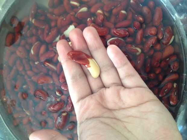 Una vez que sus granos se remojan por 12 H, escurrir y enjuagar. Squeeze granos entre los dedos, la piel se pelan fácilmente. Pieles de frijoles y enjuague otra vez