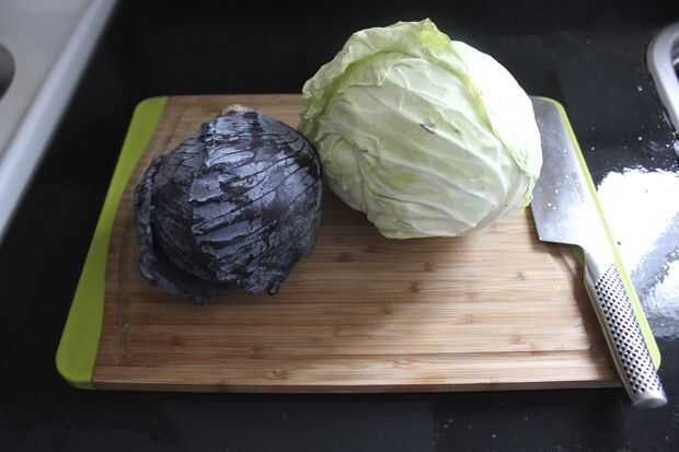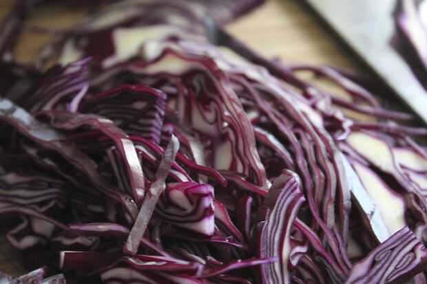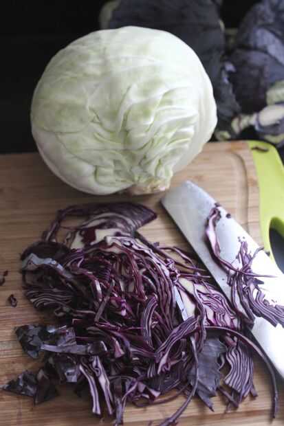 En un tablero grande del corte con un cuchillo de sharp, cuarto cada cabeza de repollo. Cortar a lo largo del diagonal para hacer hilos muy finos de col unos 2mm de espesor.