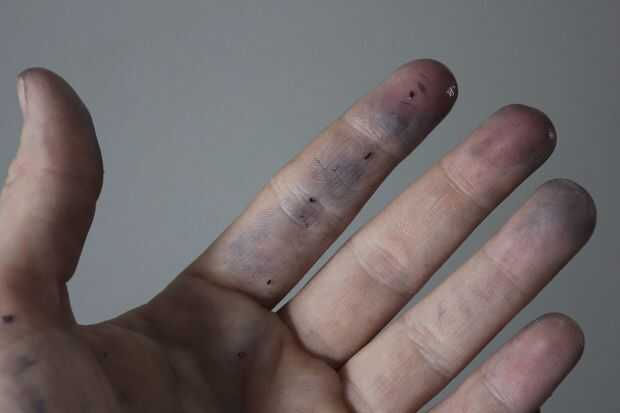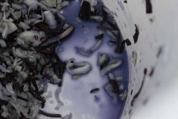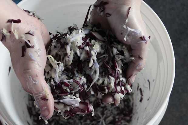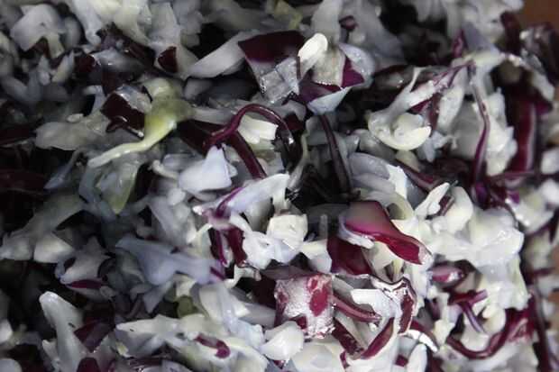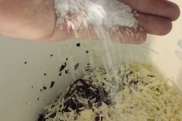 Con las manos, presione y masaje a la sal en la col. Comienza a ablandar, vaya blando y comenzar a conseguir agua. Usted puede ver cuánto jugo púrpura está saliendo de la col!
