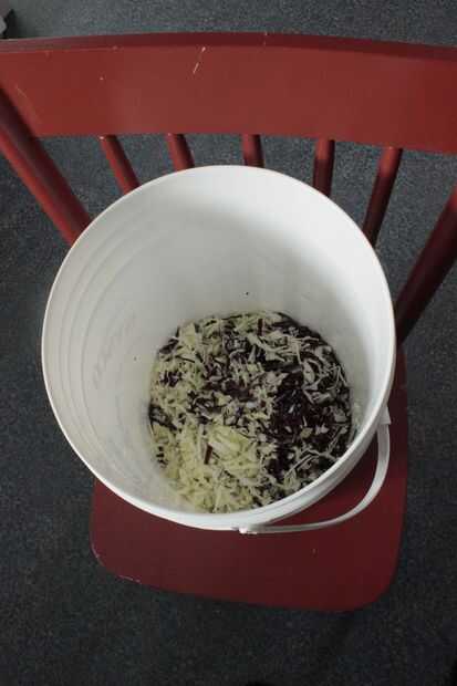 Ponga la col en rodajas en un tazón grande o limpio, cubo de grado de alimentos.