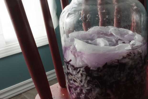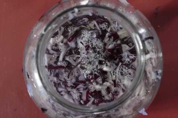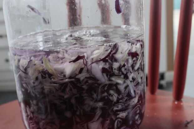 Una vez que el repollo se embala bien abajo en la jarra, añadir toda la izquierda de jugo en el cubo. Si tu col mira seco, puede Agregar una taza de agua.