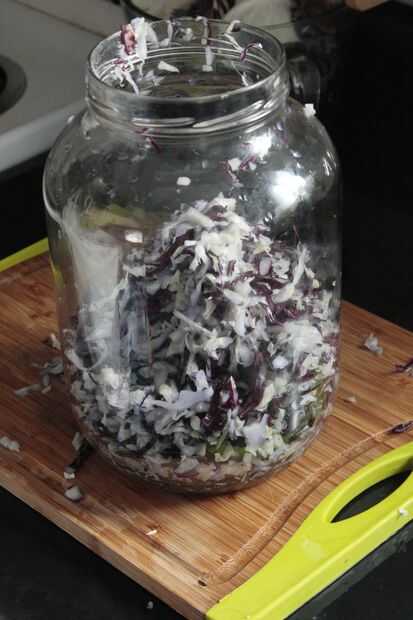 Pack el sauerkraut en su jarra. Tengo un gigante tarro que algún almacén comprado Bicks marca sauerkraut vino en. Buenas cosas, pero hecho en casa siempre es mejores. Tienda comprado o conservas sauerkraut con calor mata las bacterias buenas, así que su sabrosa pero no tienen mucho ir para él.