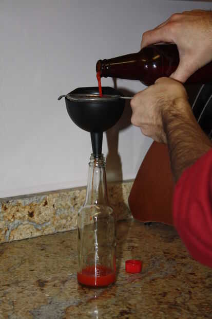 Una vez la fermentación ha terminado, en unas 2 semanas, puede verter su puré de pimienta fermentadas a través de un tamiz o una estopilla en otro frasco limpio. Usted puede ya sea parada aquí o extracto de su fermeneted puré mezclándolo con vinagre durante la noche (enjuague) o por empezar el proceso otra vez agregando nuevos dulce puré de pimientos y salmuera.