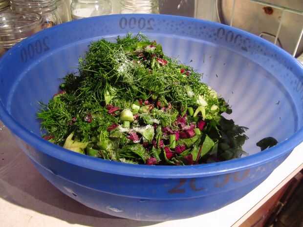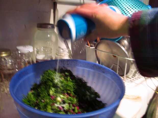 La sal de cada capa de verdes como van en el recipiente para que la sal se distribuya uniformemente. (es decir, volver al paso 3 para el próximo manojo).