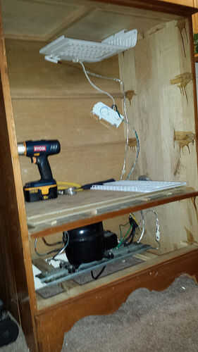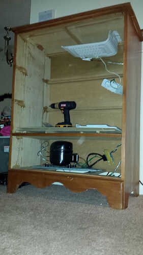 Después de una batalla épica con la mini nevera y tratando a todos los componentes internos del músculo y plomería sin el doblez o todo lo puse al lado y comenzó a trabajar en el aparador prensar. Este aparador particular tenía 4 bahías de cajón. Los cajones no eran en este aparador cuando hice como un bandido con él desde el contenedor de basura zona, por lo que quité todos los espaciadores además el último inferior. La parte inferior uno servirá como el piso a la parte de la fermentación de la unidad, mientras que el espacio alberga todos los componentes del compresor y electrónica necesaria para funcionar. izquierda en el aparador eran dos hojas de tablero de partícula muy fina que separa la cavidad de cada cajón. Usé esto para crear un poco de un vacío entre el compresor compartimiento y fermentación piso puesto que el compresor calienta el piso durante tiempos de uso pesado y podría afectar la temperatura de cámaras. Llena este vacío con espuma de aislamiento spray "Grandes cosas" mientras también recubren el techo del compartimiento del compresor con el protector termal de Home Depot. Una vez me di cuenta de la configuración básica y el diseño de mi cámara. Era tiempo para el aislamiento.