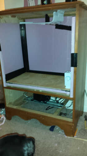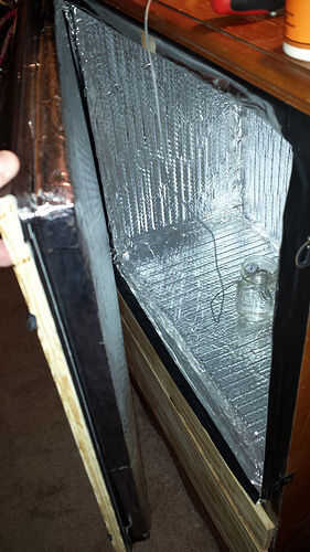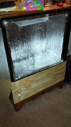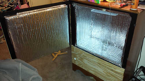 Una vez completos todos los lados, añadí el segundo de los tableros de partículas sobre el pedazo de piso de aislamiento para añadir fuerza y también proteger contra el calor del compresor que mencioné en el último paso. Una vez que la primera capa de aislamiento fue hecha fue a añadir la capa de respaldo protector de calor de hoja junto con la cinta térmica de aluminio en todas las grietas. Una vez que cada superficie de la cámara estaba cubierta con la segunda capa de aislamiento metálico que corrí algunos cool down y manteniendo controles durante los próximos dos días ver 1. Cuánto tiempo tarda para obtener la temperatura abajo mi temperatura de fermentación de entre 60 y 75 grados y 2. Cuánto tiempo podría mantener la temperatura ambiente mientras el sistema de refrigeración unidad fue apagado.