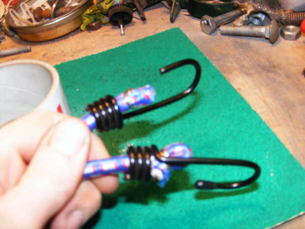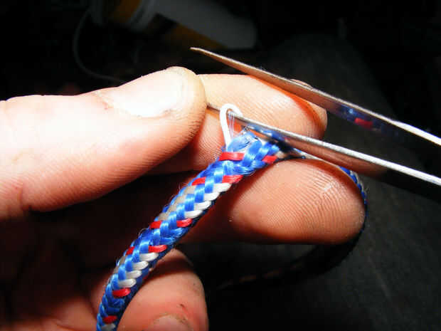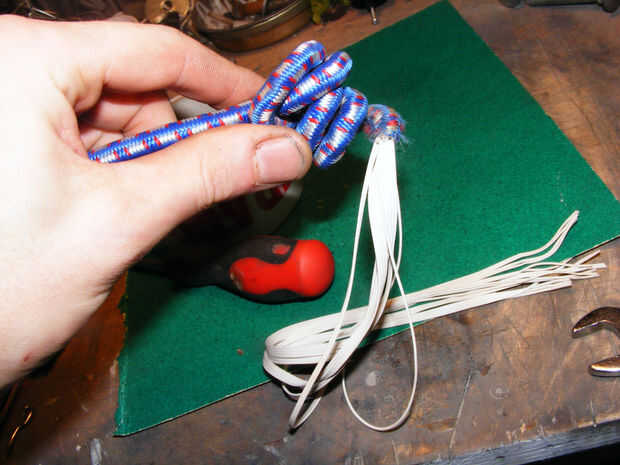 Retire los ganchos y el elástico de una cuerda del amortiguador auxiliar. ayuda a la fuerza y entusiasmo. encontré que los trocitos de elástico se quedan en medio de la trenza, pueden enganchar hacia fuera a través del lado de la trenza con las pinzas. pedacitos sueltos de goma interior que enhebrar el hilo casi imposible.