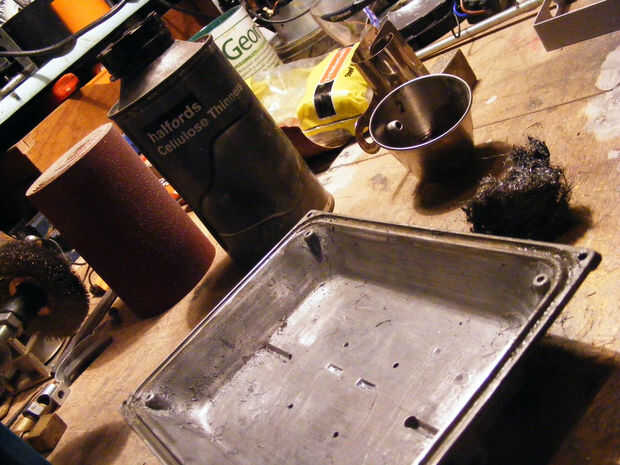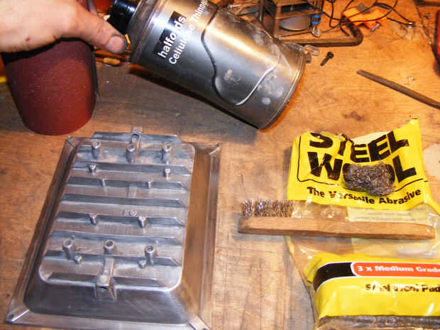 después de mucha lentitud, me pareció que un cepillo de alambre de latón y diluyentes de la manera más eficiente de bajar la mayor parte de la pintura. (ver avisos de seguridad de paso de remoción de pintura anterior).