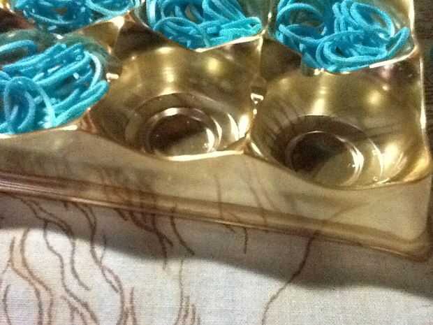 Aquí, primero voltear el papel de fondo y el blanco hacia abajo. Después, llena las divisiones pequeñas con esas bandas de goma como se muestra. -Compro mis bandas semana tras semana y con sólo cuatro colores a la vez.
