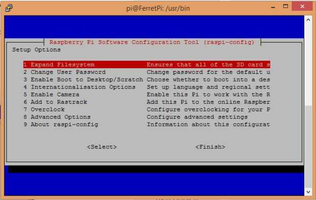 Si hiciste todo bien, Raspbian debe comenzar a arrancar. Usted a recibido con un impresionante fondo azul donde usted puede comenzar a configurar te FerretPi. Iniciar sesión con el usuario predeterminado y la contraseña (username: pi, contraseña: frambuesa).