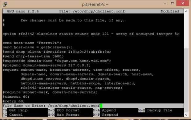 Busque la línea que dice "#send nombre de host"andare.fugue.com";" y quite la octothorpe (#) de esta línea. Cambiar el nombre de host que desea "andare.fugue.com" (una vez más, elegí "FerretPi"). Nano de salida escribiendo "Ctrl-x". Tipo "Y" y luego presiona enter para guardar los cambios. Probablemente tendrás que golpear entrar una vez más para ahorrar.