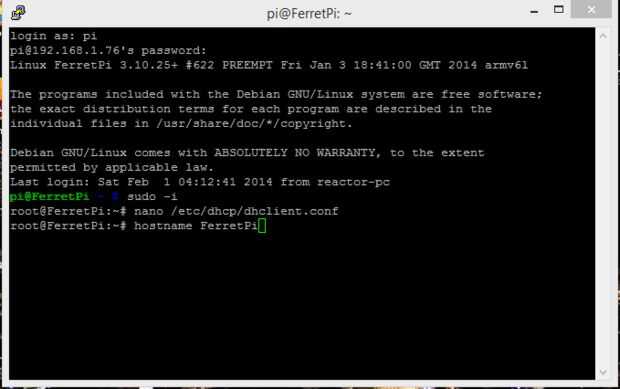 Para enviar este nuevo nombre de host para el servidor DHCP (probablemente tu router o módem), escriba "host FerretPi" en la línea de comandos bash.
