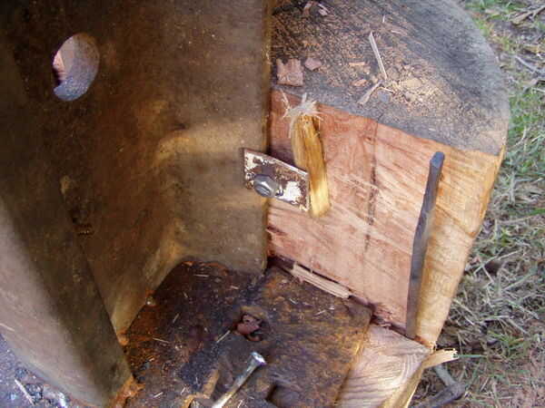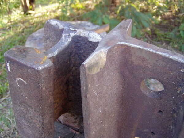 Usé algunos pequeños trozos de tornillos de acero de la placa y entrenador para fijar el riel a la sección vertical del muñón. También había martillado picos de acero por los agujeros en el plato de pescado y había doblada sobre.