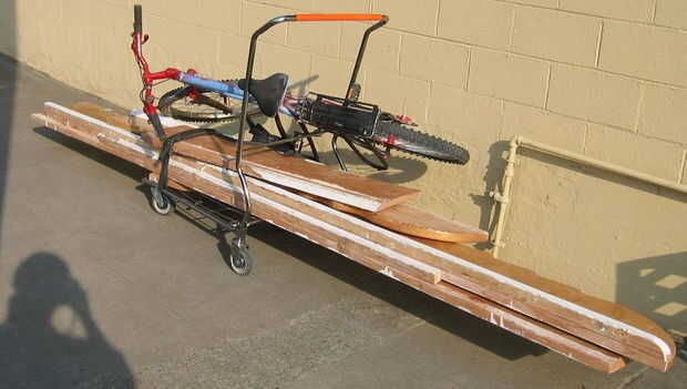 Allí cargué la madera, atada con una cámara y lanzó mi bici en la parte superior. Empujó hacia atrás a pie.