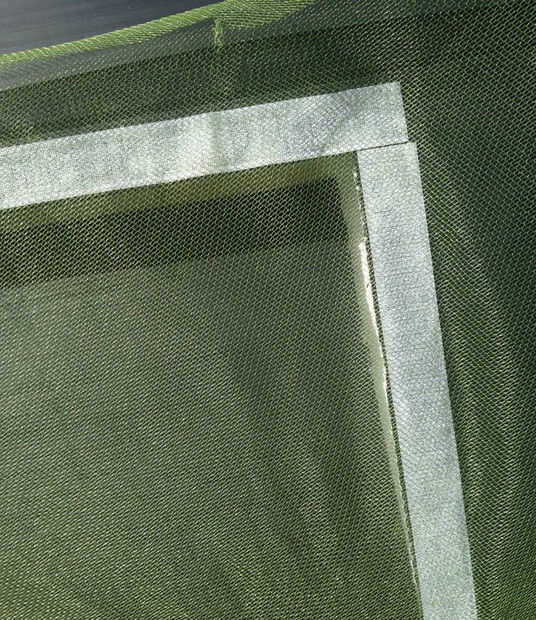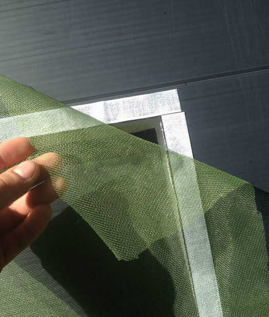 4. cortar malla bug el ajuste un poco más allá del perímetro del velcro. Luego, presionar la malla sobre los ganchos del velcro, esto le da un mosquitero removible que no requiere ninguna costura mientras que siendo más rápido y más fácil que una cremallera.