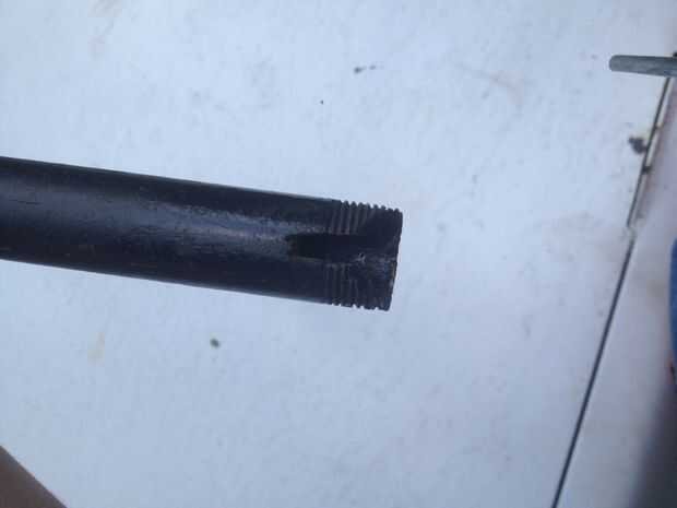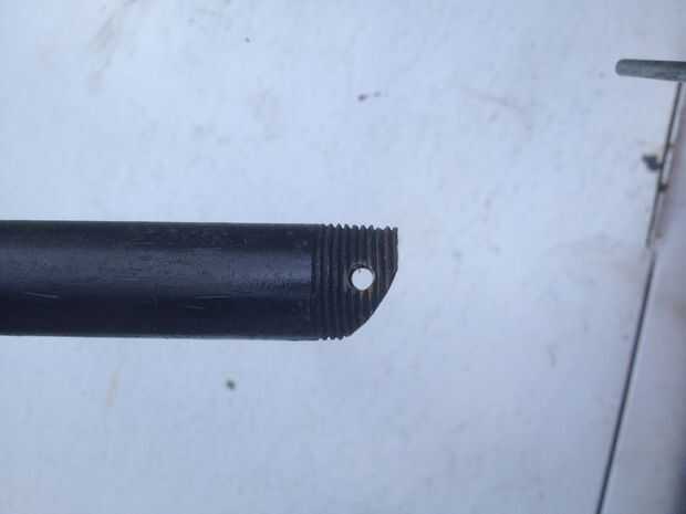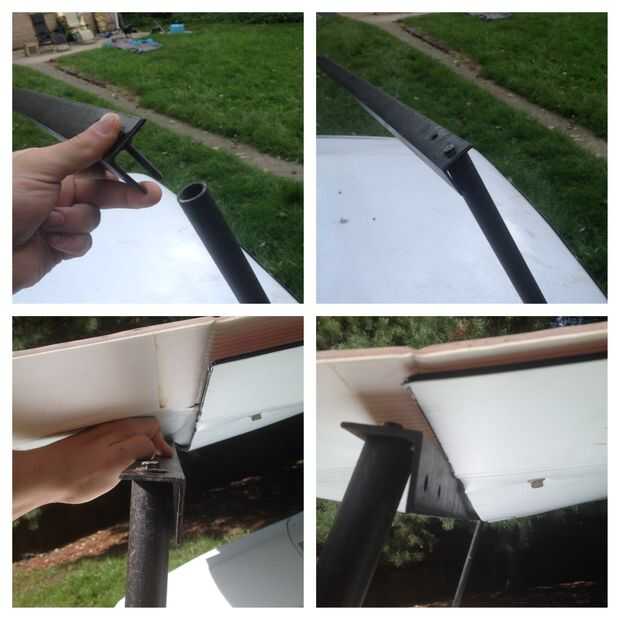 2. los dos puntales que hice fue reciclado de un viejo tubo negro. En el extremo que entra en contacto con las piezas recientemente soldadas, he cortado otra ranura y había perforado toda a línea hacia arriba con los ya existentes. Un pin o tienda ranuras de estaca en el agujero para fijar los puntales en su lugar.