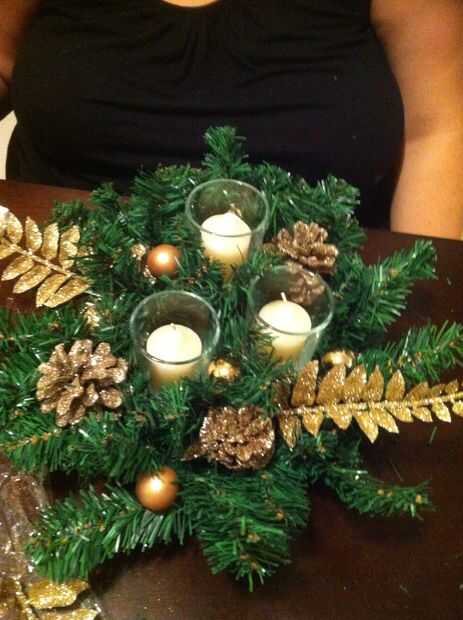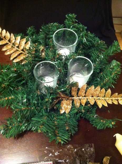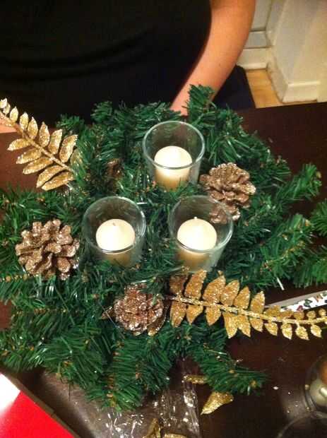 Organizar tus decoraciones de todos modos quieres pero me pareció más fácil si las ramas de oro primero y arregló la piñas y adornos a su alrededor.
