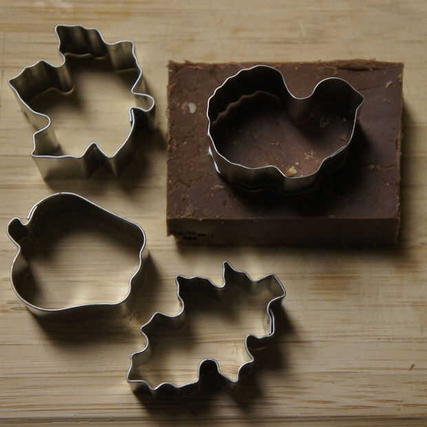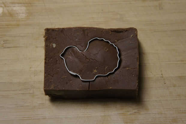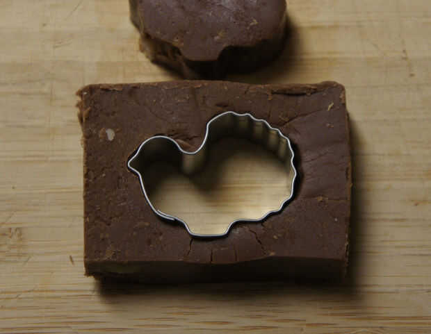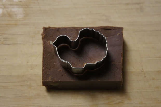 Lugar un cortador de galletas en el centro de un chocolate fudge Plaza. Empujar la forma desde abajo para golpear hacia fuera el pedazo de dulce de chocolate. Ponga a un lado.