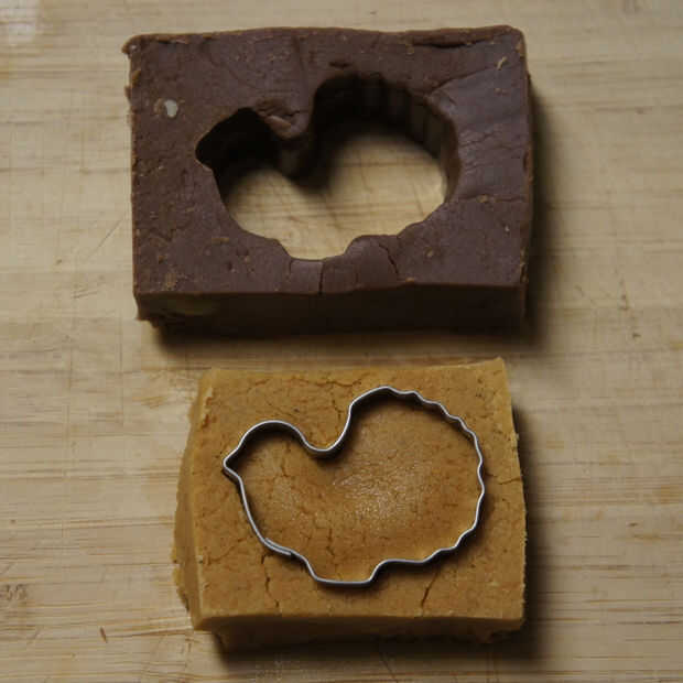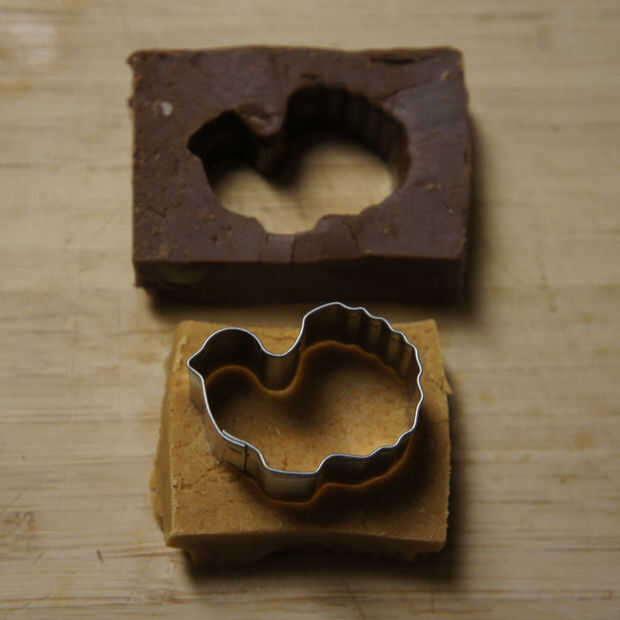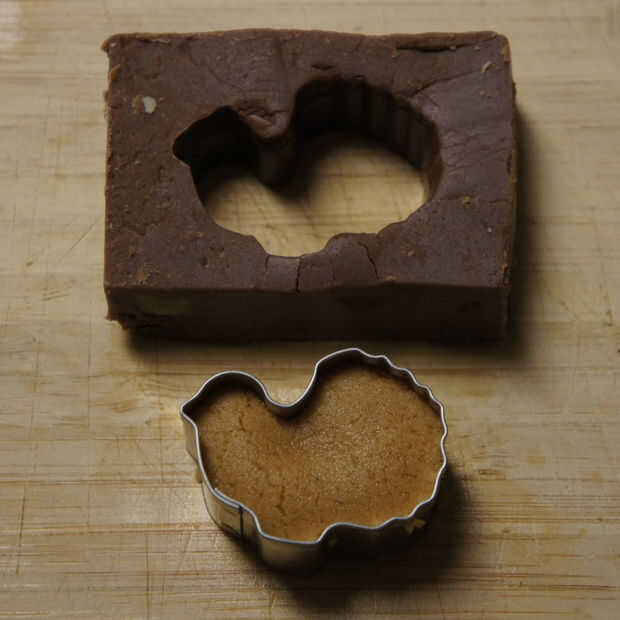 Coloque el mismo cortador de la galleta en el centro de un pedazo de la calabaza dulce de caramelo. Empujar la forma desde abajo para golpear la pieza de chocolate. Ponga a un lado.