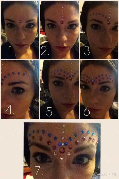3. desde el rhinestone grande, usando gemas de tamaño medio, crear una línea arqueada que atraviesa el centro de la frente y abajo hacia el templo