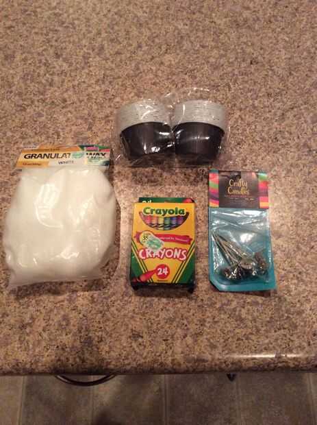 Vela: Taza de cristal pequeña. Como se ve en las tazas de Dixie cuadro 9. Caja de lápices de colores. Microondas. Cera. Mechas de algodón.